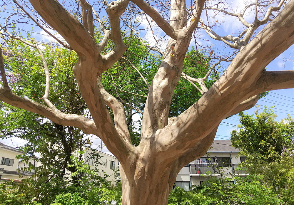 「サルスベリ」という和名には、ちょっとユニークな由来があります。これは、古い樹皮がはがれ落ちた後に現れる、つるつると滑らかな木肌にちなんでいます。“木登り上手なサルでさえすべってしまう”という、どこか愛らしい例えから名づけられました。幹の肌が美しく、光を反射して独特の風合いを見せてくれることから、樹姿そのものにもファンが多い木でもあります。