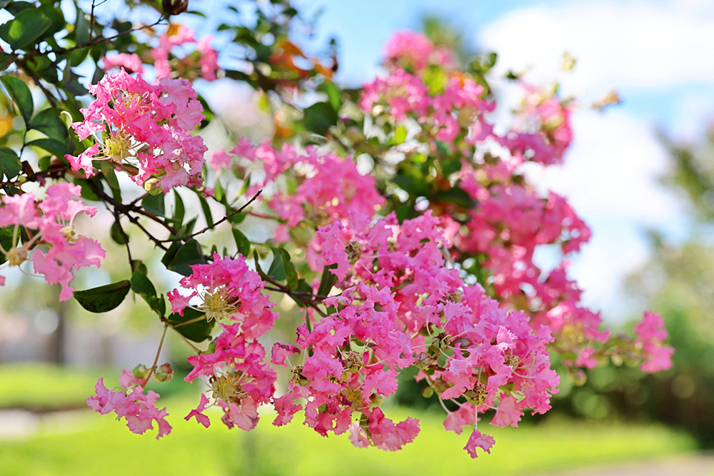漢字では「百日紅(ひゃくじっこう)」と書きます。この名前は、夏から秋にかけて約百日もの間、赤や白、ピンクなどの花を咲かせ続けることに由来しています。枝先にふんわりと咲く花々は、まるで綿菓子のようにやわらかく、遠目にも華やかで目を引きます。長い開花期間を持つことから、夏の花としてだけでなく、初秋の風景にも彩りを添える存在です。