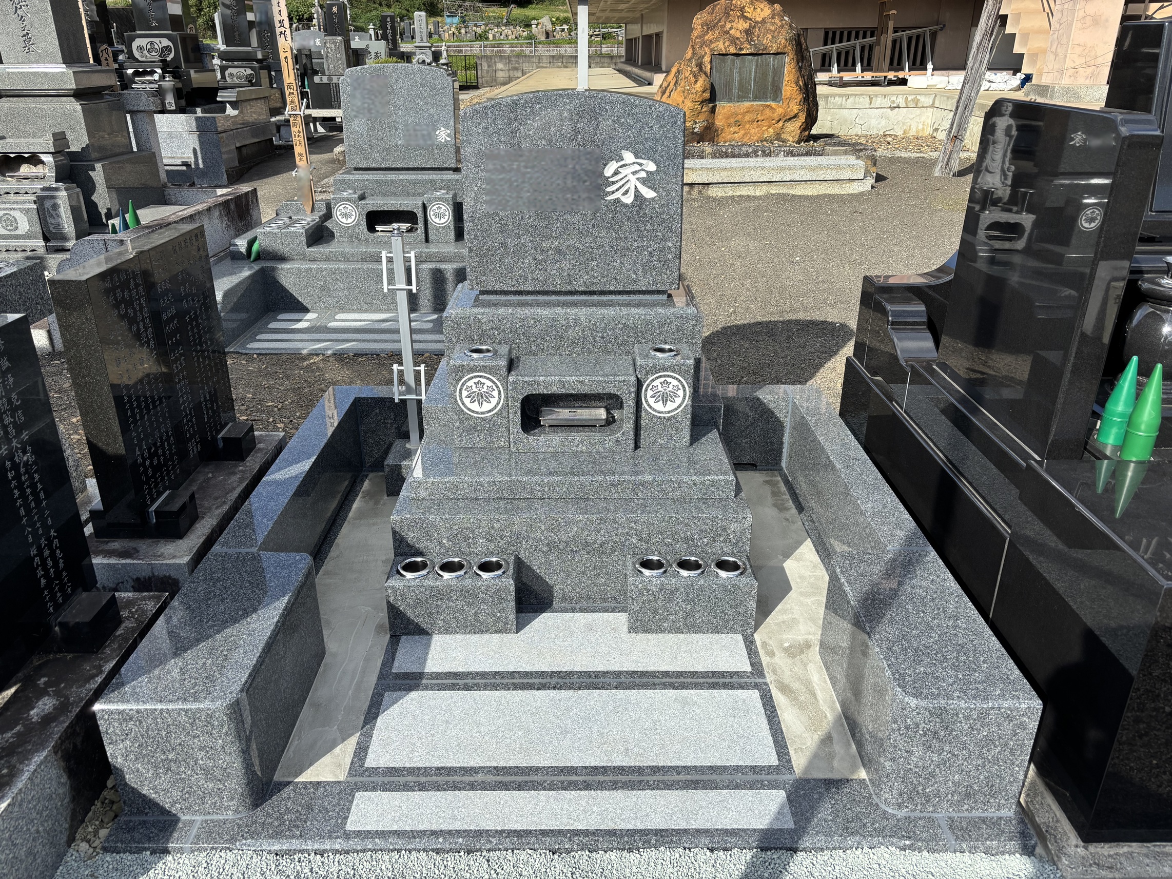 グレー系の石を使用したお墓をお世話になりました。グレー系の石(主に名称に654が付く石種)は水を吸った部分とそうでない部分の差が大きく、経年の見た目に難がある石種が多いのですが、昨年から使用しているこちらの石はそういったこともなく大変おすすめの石になります。