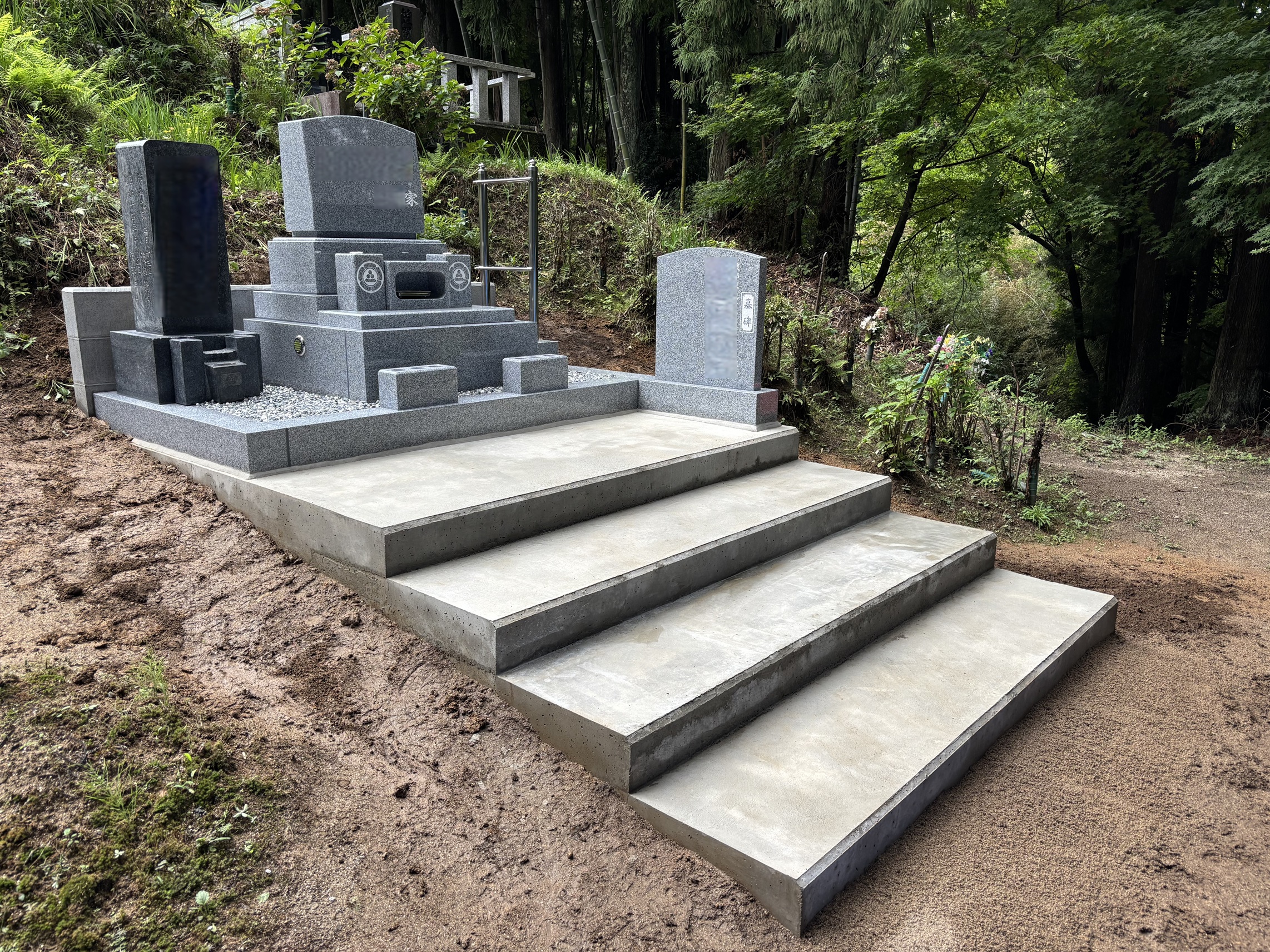 区画の勾配が強いため、階段状にコンクリートフロアを4段造成して、最上段へ墓所本体を設置いたしました。石材店の現場施工はコンクリート作業やセメント作業も多いです。そのためきれいに平らに勾配を付けて均すなど、左官屋さんや基礎屋さん並の技術が求められます。この技術、私自身独学ではありますが、石工として走り出した当時と比べればずいぶんと上達したでしょうか。石工の技術はもちろんのこと、こちらの技術も職人としてゴールはありませんね。