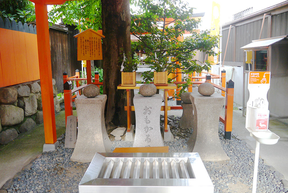 次は、本社の境内から少し歩いて末社の大歳社へ。境内の奥にある小さな祠の中には3つの丸い石が鎮座しています。これが「おもかる石」と呼ばれ、願いごとが叶うかどうかを占うことができる霊石です。まずは二礼二拍手一礼をし、両手で石を持って重さを確認。次に石に手を置いてお祈りをし、再び石を持ち上げます。2回目のほうが軽く感じれば、願いごとが叶うといいます。