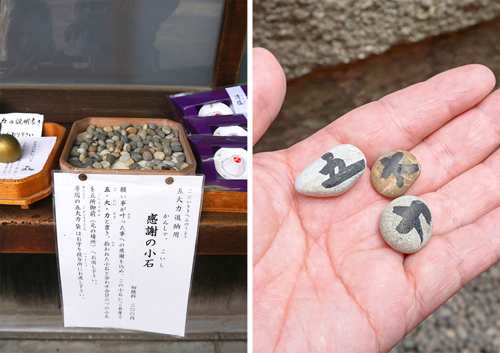 もう一カ所は、本社の境内にある「五所御前」。石玉垣から手を入れ、たくさんの小石の中から、「五」「大」「力」と書かれたものを探します。無事に3つを見つけられたら専用の袋に入れてお守りに。体力・智力・財力・福力・寿力を授かることができるというから、もう怖いものなし!?