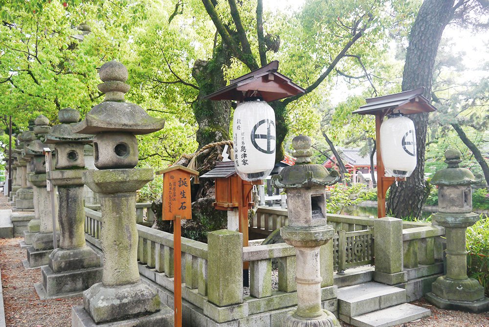 鳥居をくぐり、本殿に通じる反橋を渡って左手に少し歩くと、「誕生石」という表示が現れます。しめ縄のついた大木の下、石灯籠と柵に囲まれて鎮座する大きな石には、神々しさが漂っています。源頼朝の寵愛を受けた丹後局(たんごのつぼね)がここで大きな石を抱いて男児を出産したと伝えられており、安産祈願を受けた後、ここの小石を拾って安産のお守りとすることが習わしとか。看板には緊迫感のある歴史物語が綴られており、御利益がありそう!と思わせます。